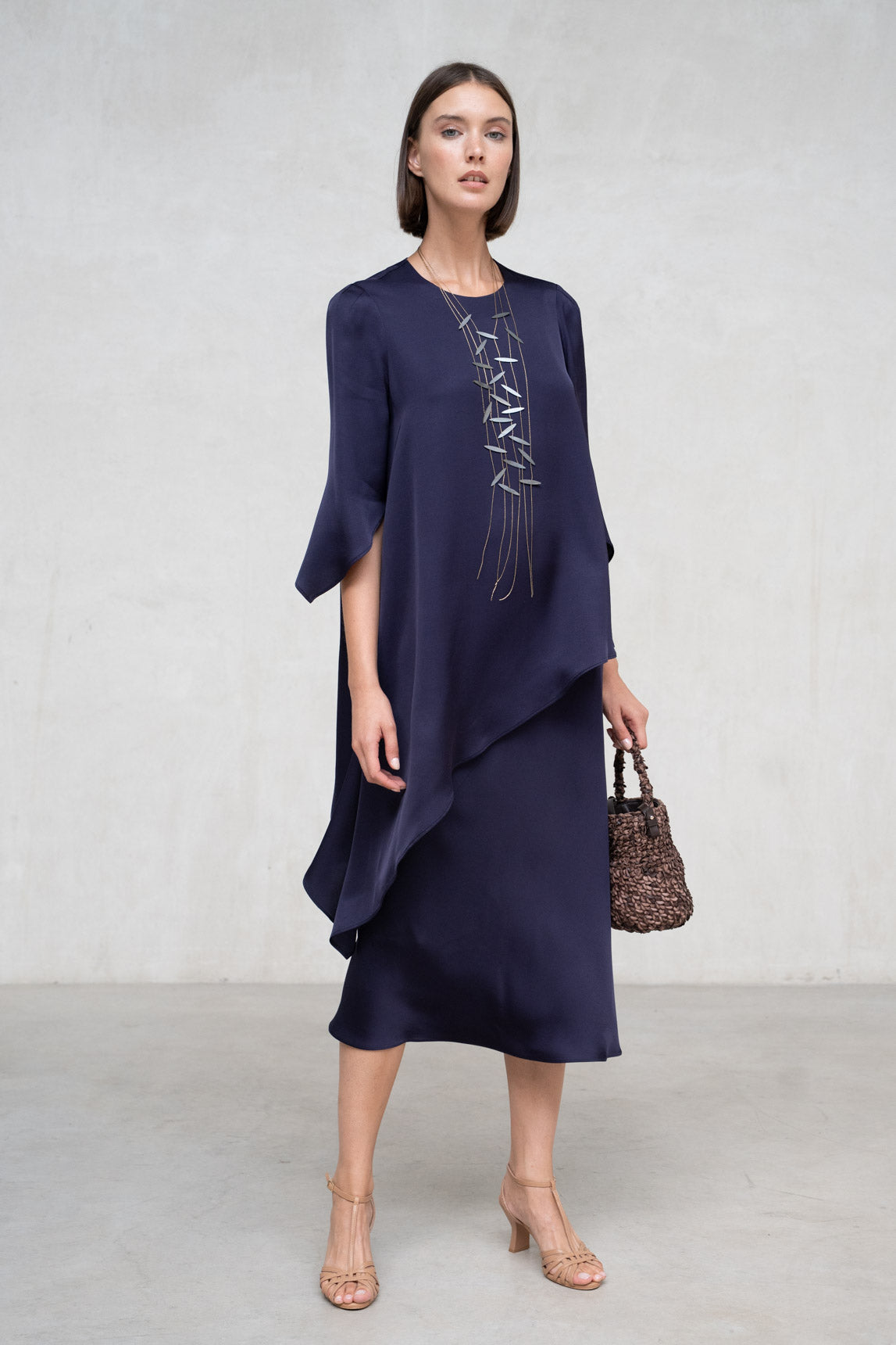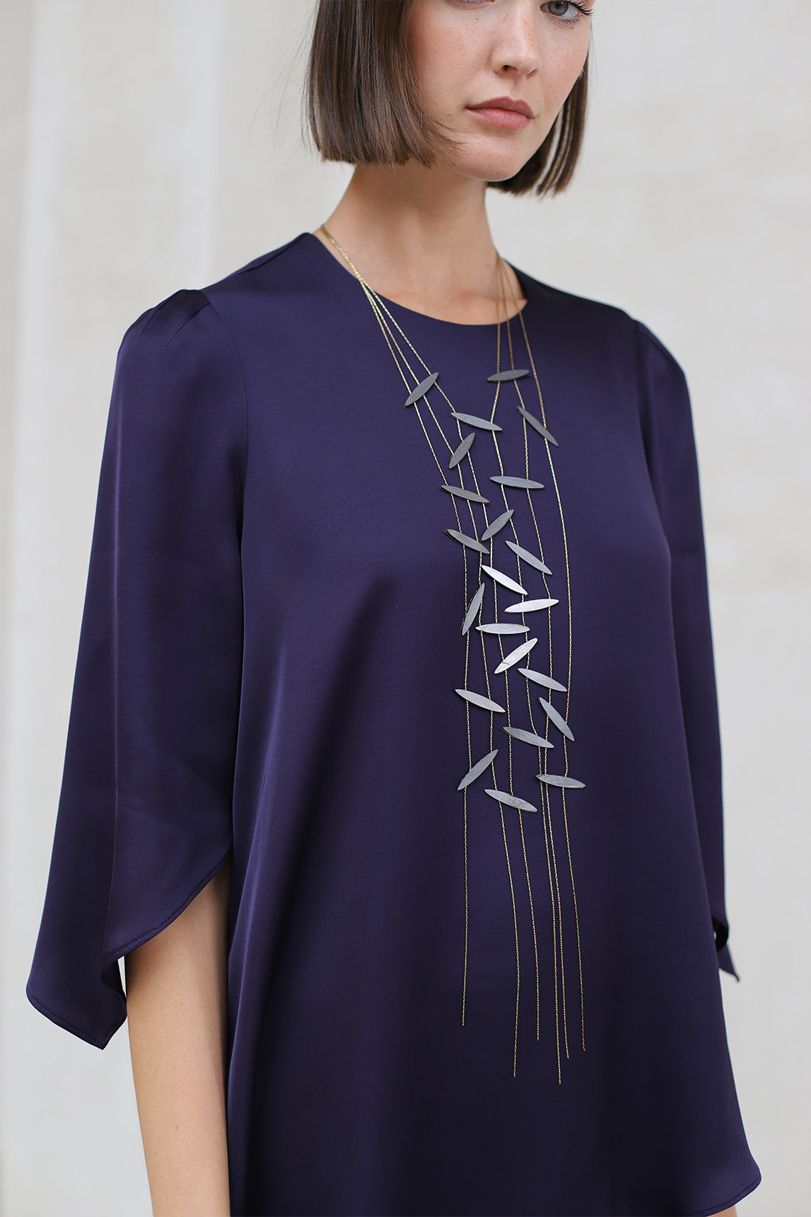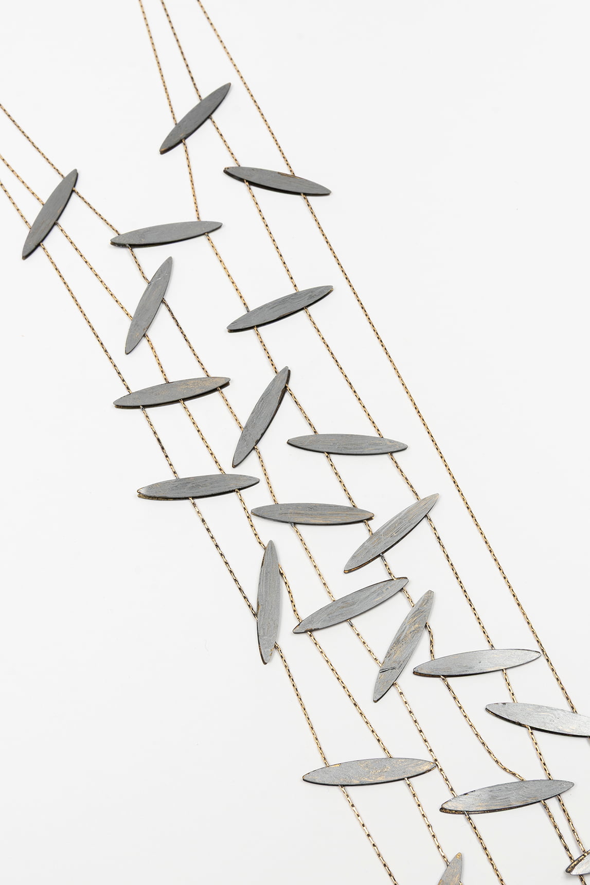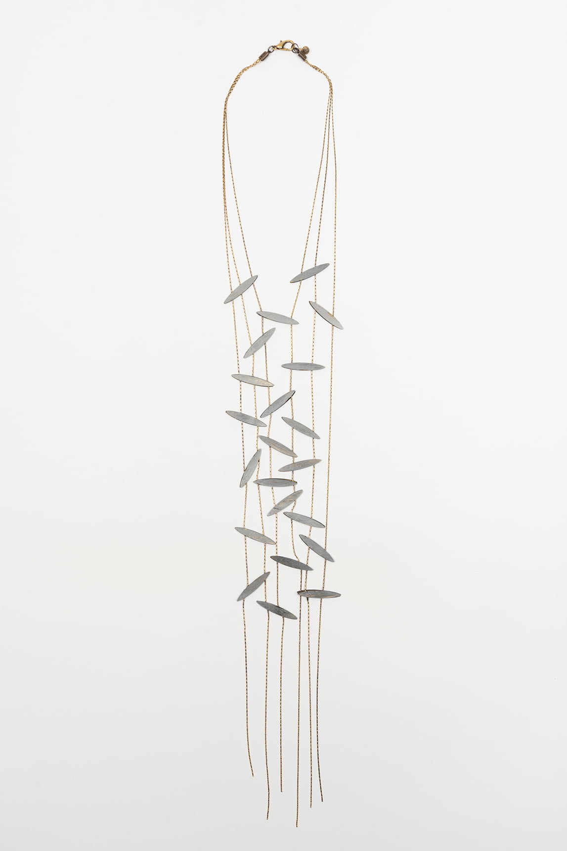 Este collar largo destaca por su estructura de múltiples hilos dorados que caen en cascada, decorados con piezas metálicas plateadas en forma de cápsula. Su diseño etéreo y sofisticado añade movimiento y brillo sutil a cualquier conjunto, convirtiéndolo en el complemento ideal para estilismos monocromos, camisas amplias o vestidos de tejidos fluidos. Una pieza versátil que aporta un aire artístico y moderno con un toque artesanal.