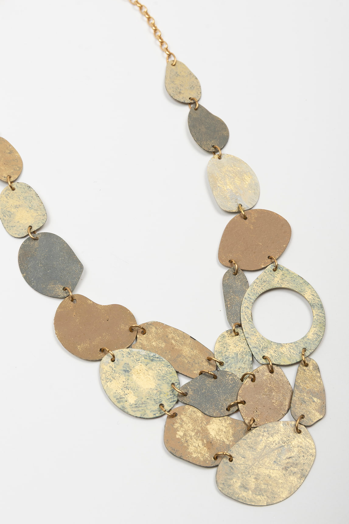 Collar tipo declaración con cadena dorada y composición de placas ovaladas superpuestas en acabados metálicos combinados, con efecto texturizado que refleja la luz de forma irregular. En el centro se concentra un conjunto de piezas redondeadas a distintas alturas que aportan volumen visual, acompañado por un aro circular liso que abre el diseño y le da un aire escultórico. El cierre de mosquetón con tramo de cadena permite ajustar la altura para adaptar su caída al escote.