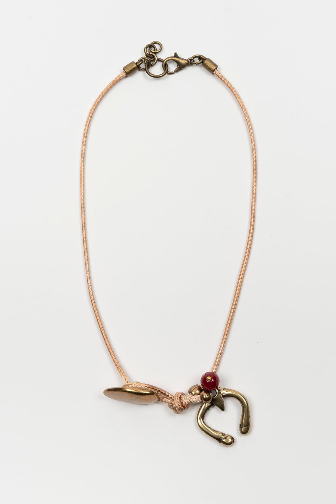 El collar Nerelia en acabado latón combina delicadeza y carácter en un diseño fino con pequeños charms decorativos de inspiración orgánica. Su estructura ligera sostiene una composición equilibrada de piezas metálicas y detalles sutiles que aportan movimiento y personalidad.