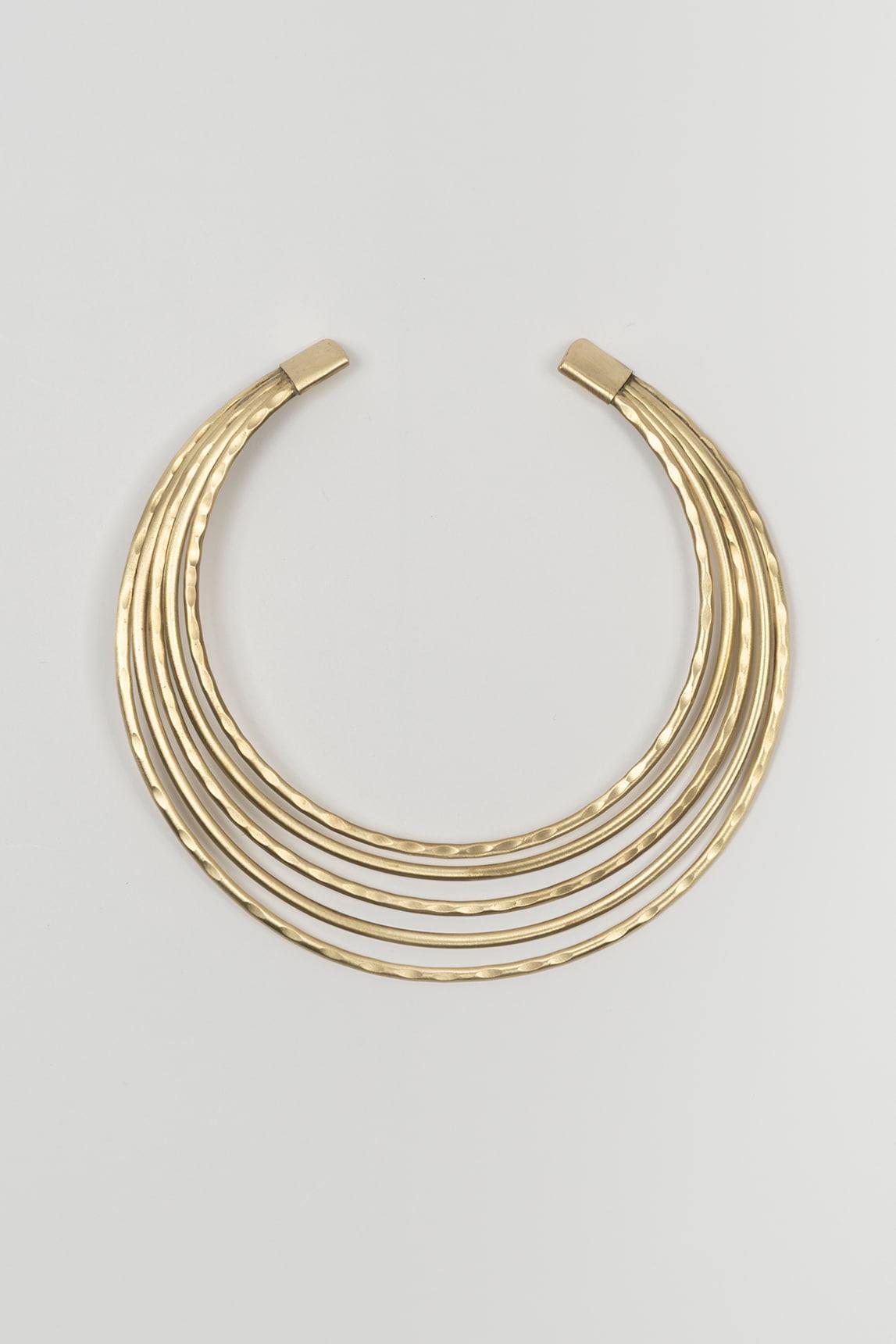 Collar de mujer en latón con diseño multicadena y estructura rígida de tipo gargantilla abierta. La pieza se compone de varias líneas finas superpuestas que crean un efecto envolvente, ligero y muy visual alrededor del cuello, aportando brillo cálido y una presencia sofisticada sin resultar excesiva. Su forma limpia y abierta refuerza una estética contemporánea, elegante y muy fácil de integrar.