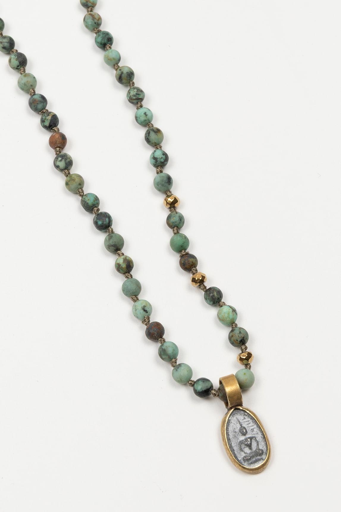 Collar de mujer con cuentas en tonos turquesa y verde con variaciones naturales, intercaladas con pequeñas piezas metálicas que aportan contraste. El diseño se completa con un colgante ovalado de acabado texturizado enmarcado en metal, creando un punto central con carácter artesanal y visualmente equilibrado.