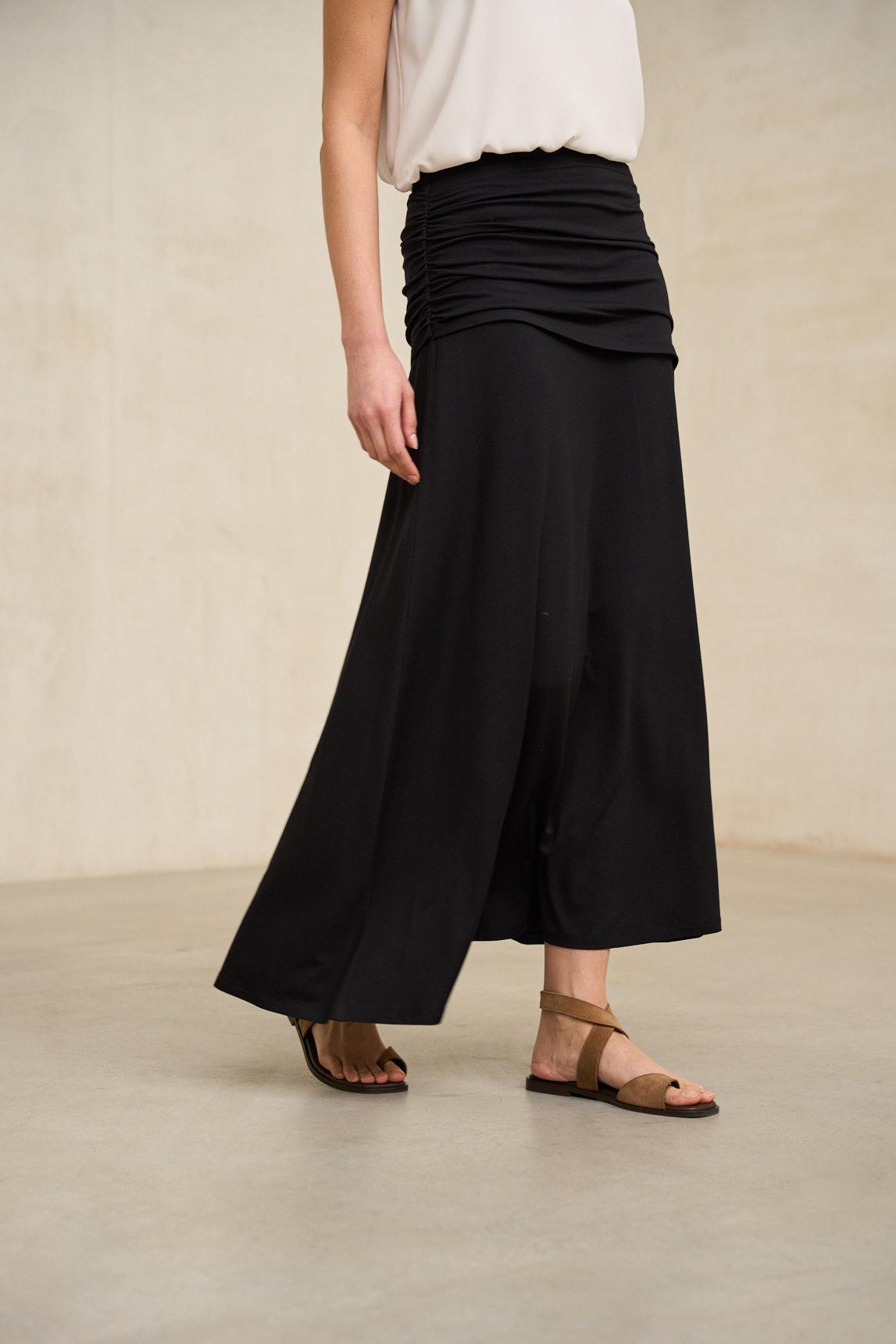 Falda de mujer confeccionada en tejido de punto fluido con drapeado en la parte superior que crea un efecto envolvente y realza la figura con elegancia. Cintura alta con banda ancha y caída natural que estiliza la silueta y ofrece un movimiento suave.