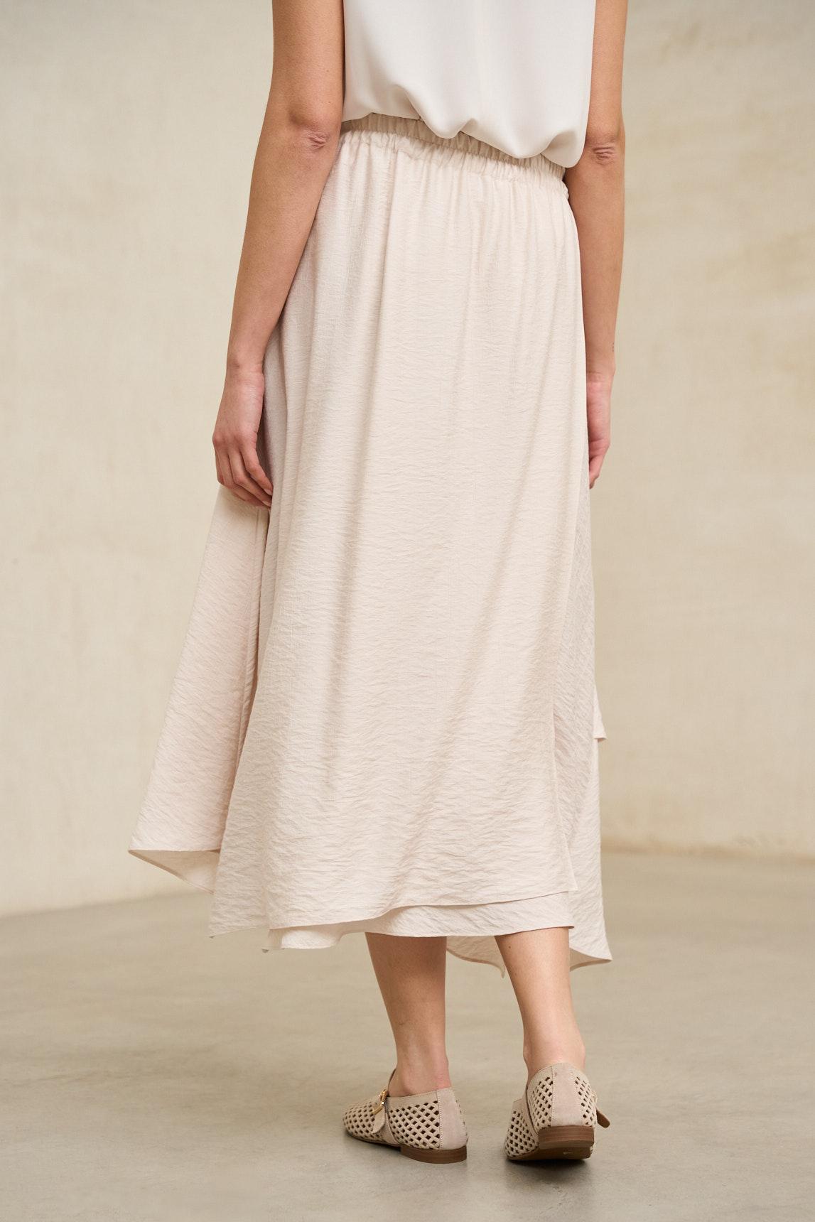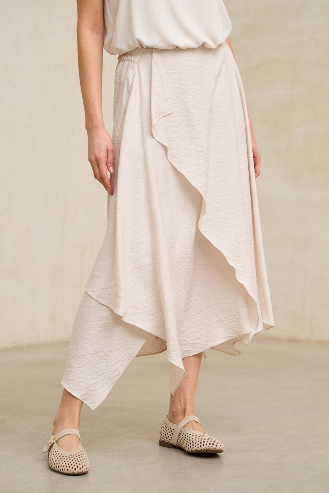 Falda midi confeccionada en tejido ligero con caída fluida y movimiento natural. Presenta diseño envolvente con superposición frontal y bajo asimétrico en diagonal que aporta dinamismo y estiliza visualmente la silueta. La estructura es limpia en la cintura, permitiendo un ajuste cómodo y favorecedor.