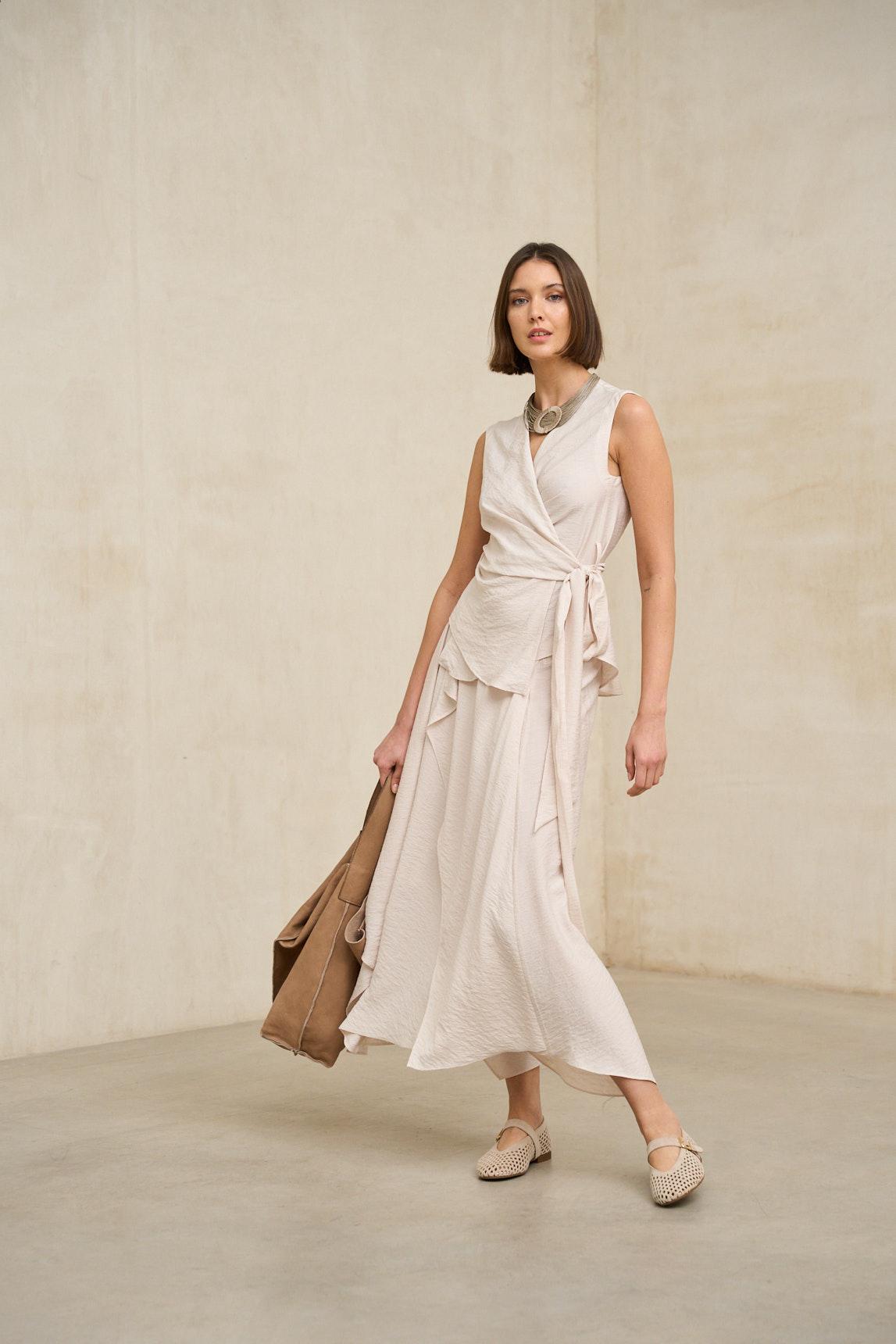 La Falda Yalira crudo destaca por su estética minimalista y elegante. Su tono neutro luminoso la convierte en una pieza versátil, ideal para combinar con blusas fluidas, tops estructurados o chaquetas ligeras en tonos arena, beige o azul suave. El juego de capas en el delantero aporta profundidad sin sobrecargar el conjunto. Perfecta para primavera y verano, funciona tanto en estilismos relajados de día como en propuestas más sofisticadas para comidas especiales o eventos informales. Una falda atemporal que equilibra sencillez, movimiento y elegancia natural.
