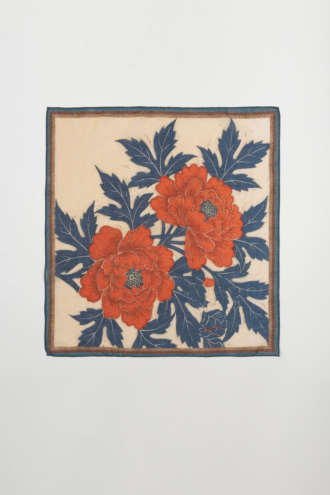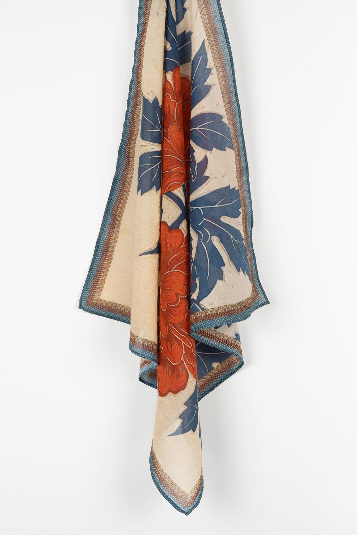 El pañuelo Azmira Azul combina un estampado de inspiración botánica con un marcado contraste entre azul profundo y naranja cálido sobre una base beige luminosa. Las hojas estilizadas y los trazos orgánicos aportan dinamismo, mientras que el borde en azul enmarca el diseño con elegancia.