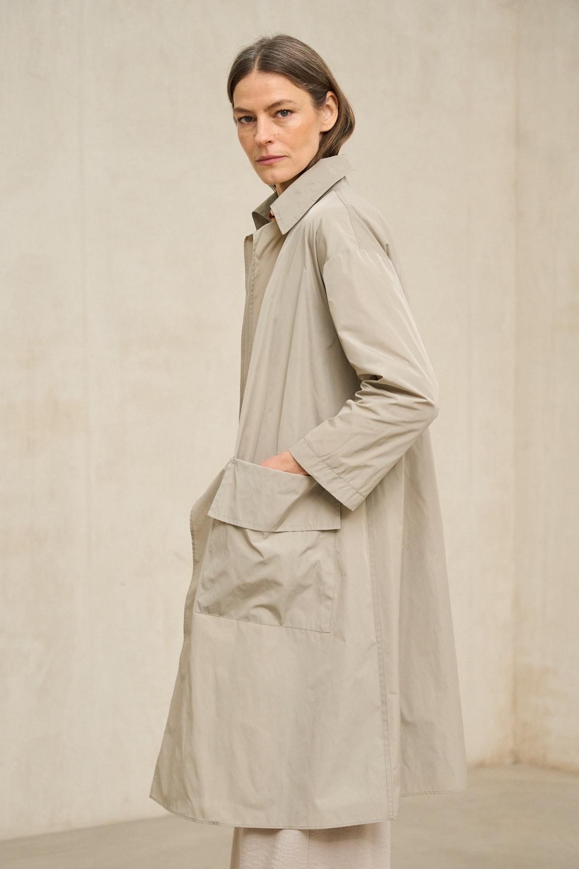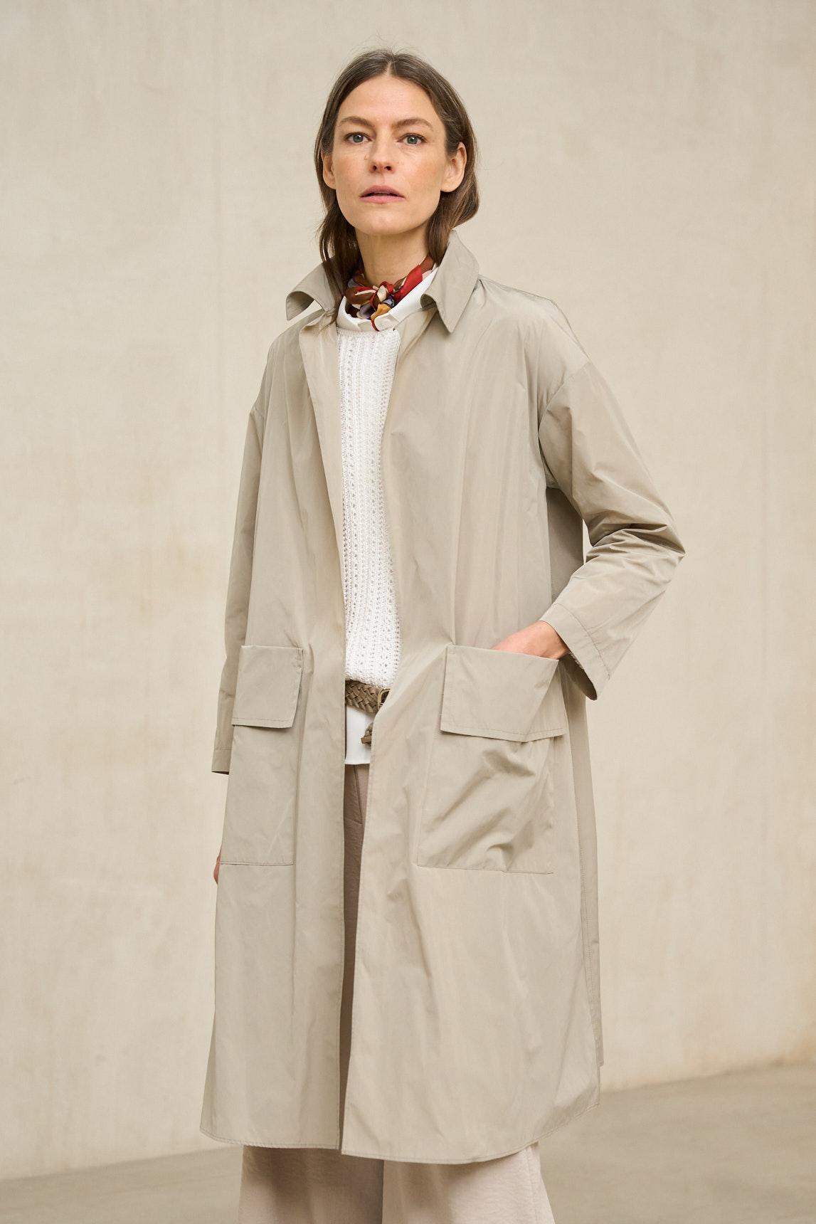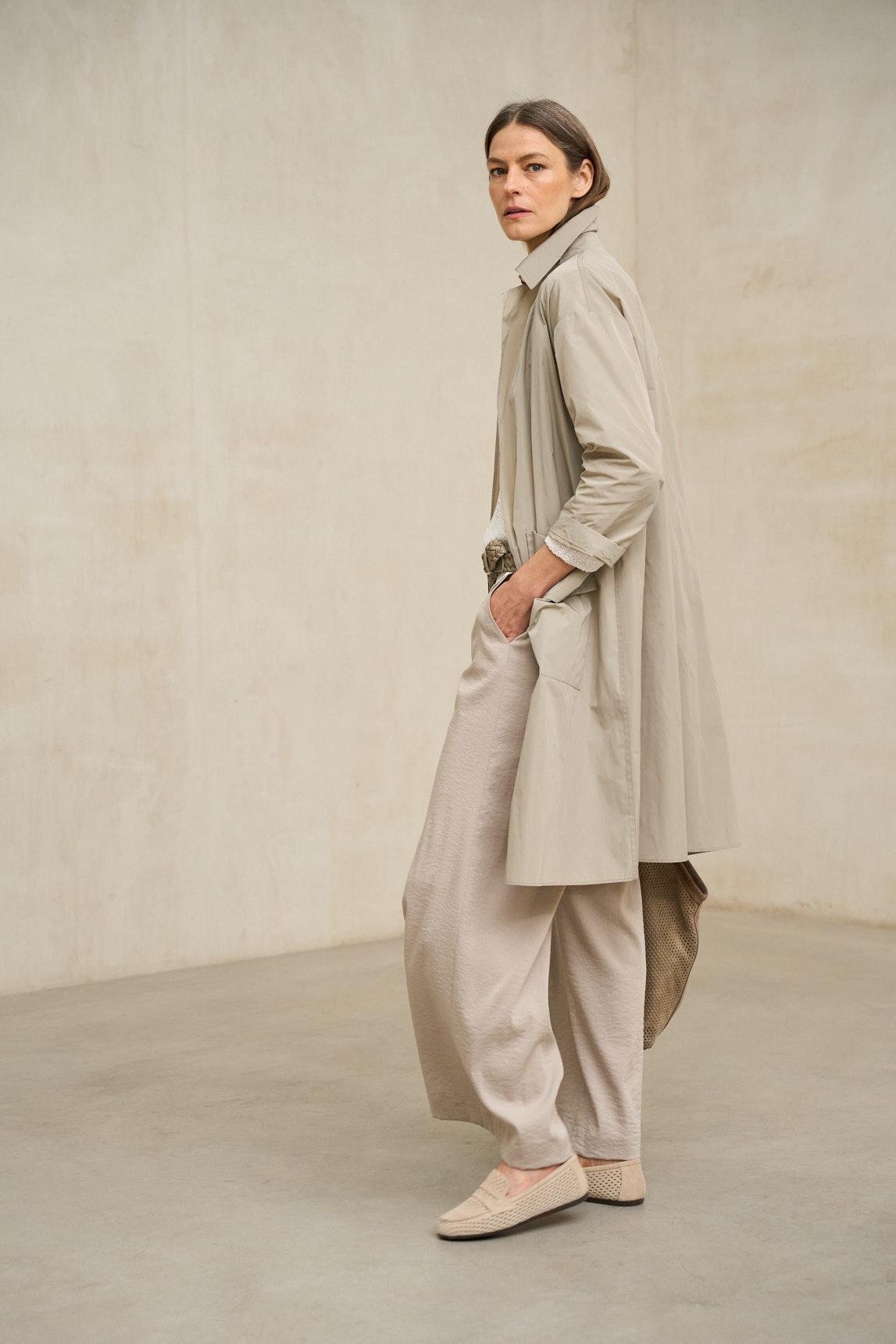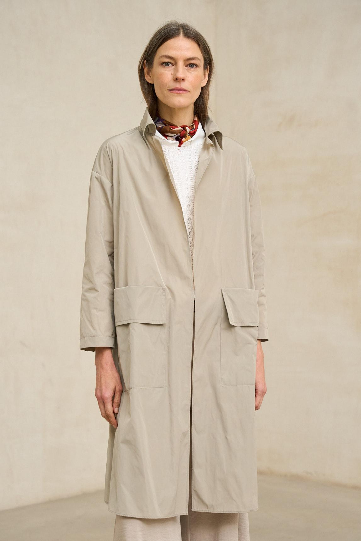 Esta gabardina ligera presenta una silueta recta y depurada, con largo midi que cae por debajo de la rodilla y estructura limpia desde los hombros. El diseño incorpora un cuello amplio y definido, mangas largas y un cierre frontal con cremallera centrada que queda integrada de forma discreta en el conjunto. En la parte delantera se aprecian bolsillos amplios y funcionales, colocados a la altura de la cadera, que refuerzan su carácter práctico sin romper la armonía visual. El tejido muestra un acabado liso con una ligera textura arrugada y un sutil brillo, aportando un aire contemporáneo y urbano. Su corte relajado permite llevarla abierta o cerrada, sobre capas ligeras o prendas más estructuradas. Funciona con facilidad en looks de diario, combinada con pantalones rectos o vestidos fluidos, y también como capa final en estilismos más cuidados. El tono beige arena aporta luminosidad y versatilidad, ideal para entretiempo y transiciones de estación. Disponible también en negro.