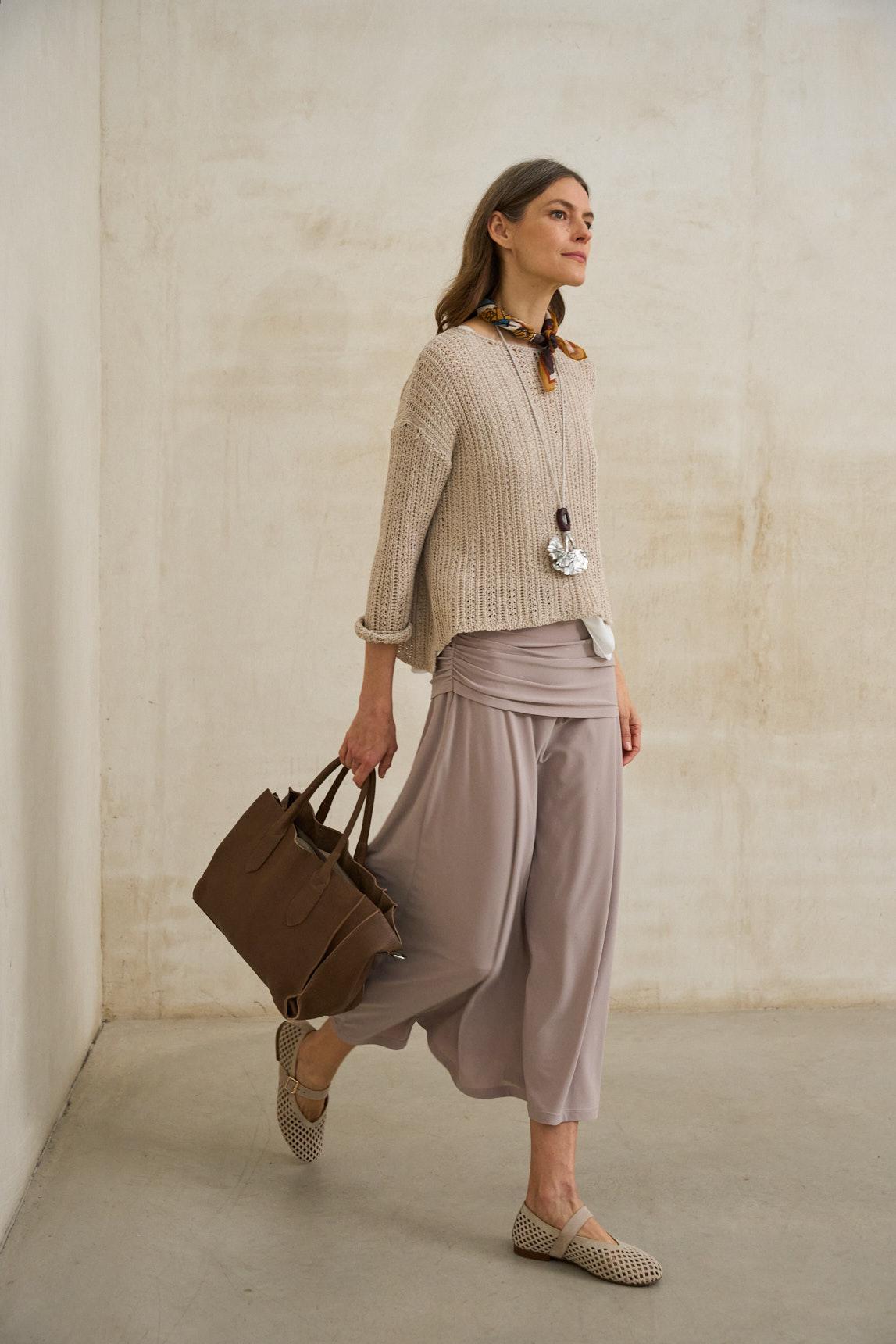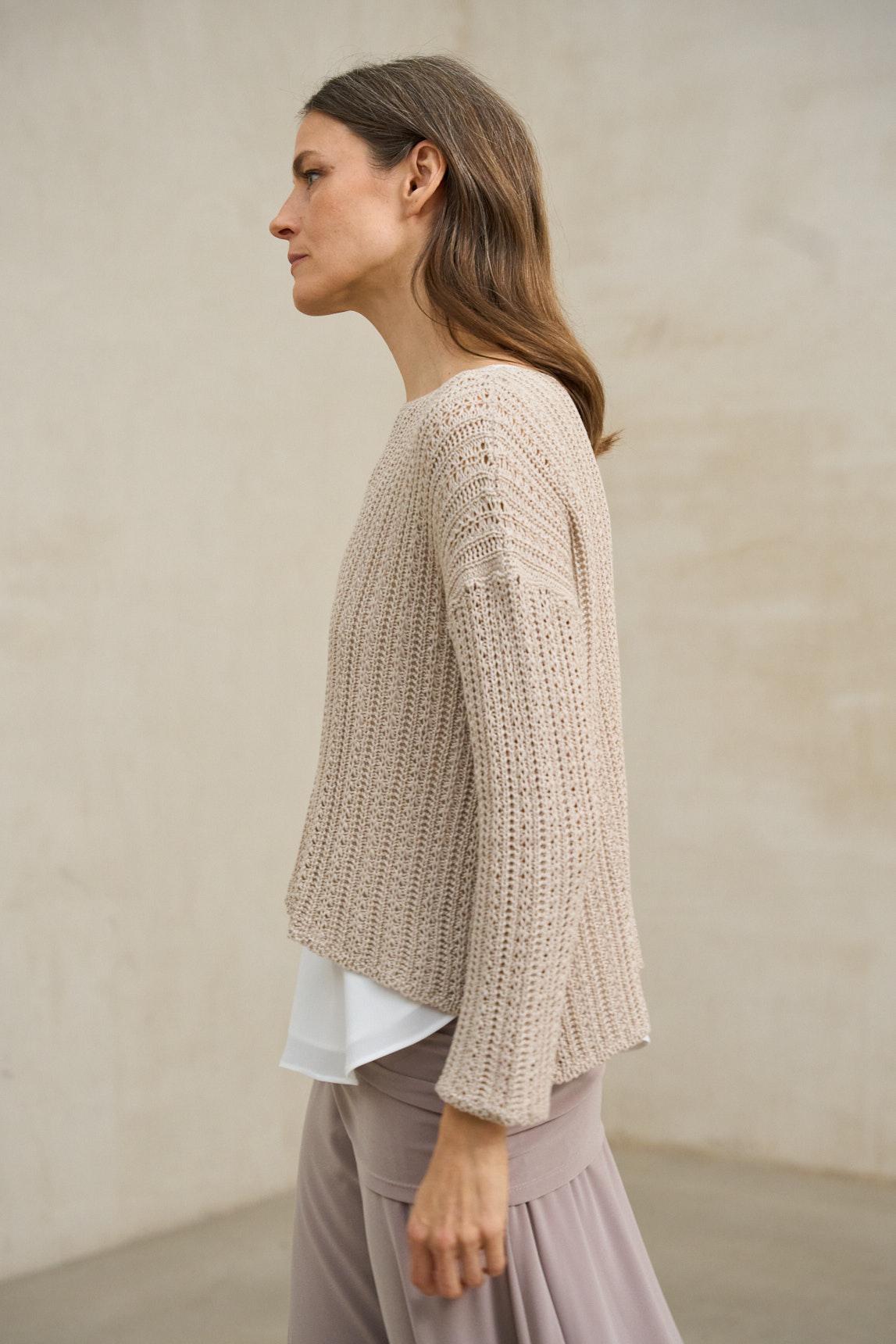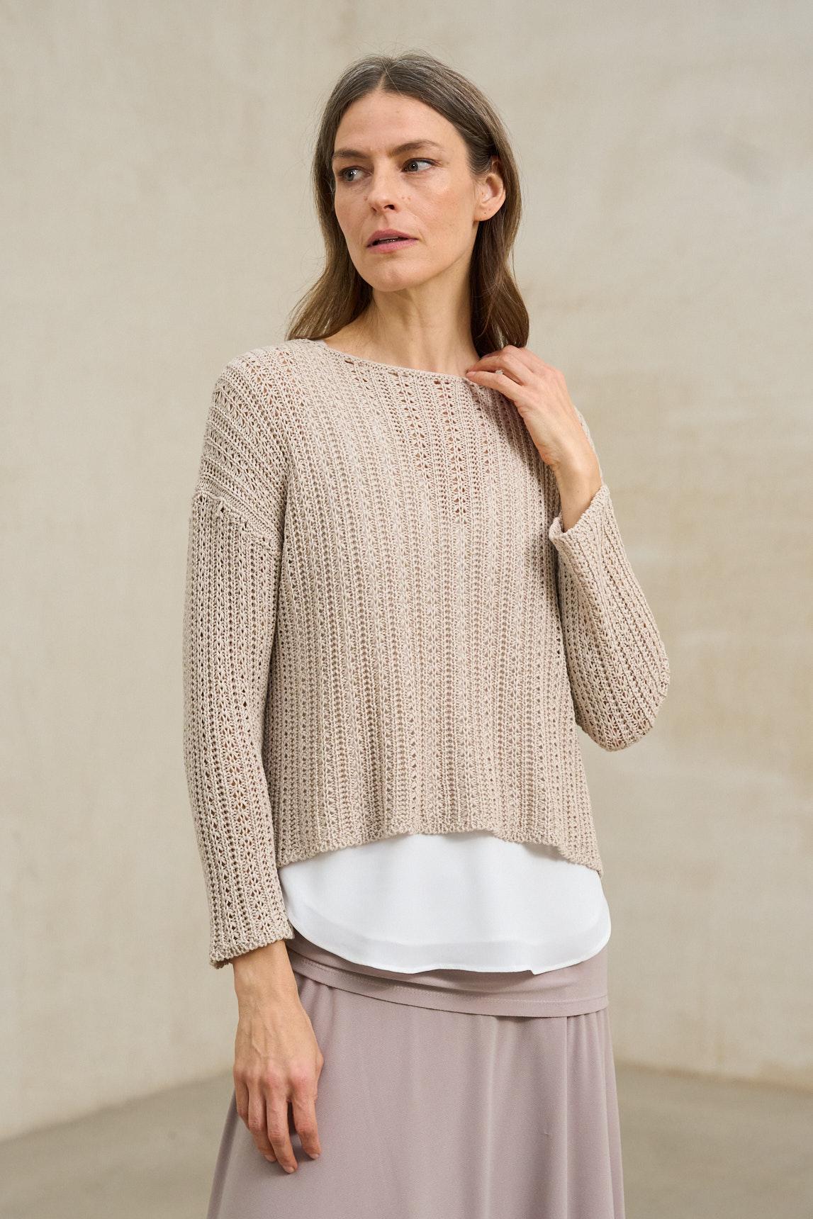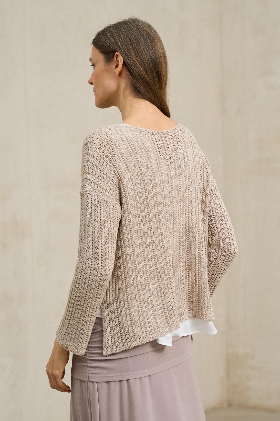 El jersey Nivara beige arena combina la ligereza del punto fino con un delicado trabajo calado en la parte superior que aporta textura y profundidad visual. Su tejido es ligeramente translúcido, por lo que se aconseja llevarlo con top interior (no incluido). Recomendamos el top Alenia blanco roto para un acabado natural y equilibrado. El diseño presenta escote amplio y manga tres cuartos, con una estructura suave que acompaña el movimiento sin ceñir. Es una prenda ideal para estilismos en capas y conjuntos de inspiración natural. El tono beige arena transmite calidez y combina especialmente bien con pantalones fluidos en crudo, verde oliva o tonos tierra. Perfecto para un armario neutro con matiz cálido. Nos esforzamos por mostrar los colores de la forma más fiel posible, pero pueden variar ligeramente respecto a la realidad.