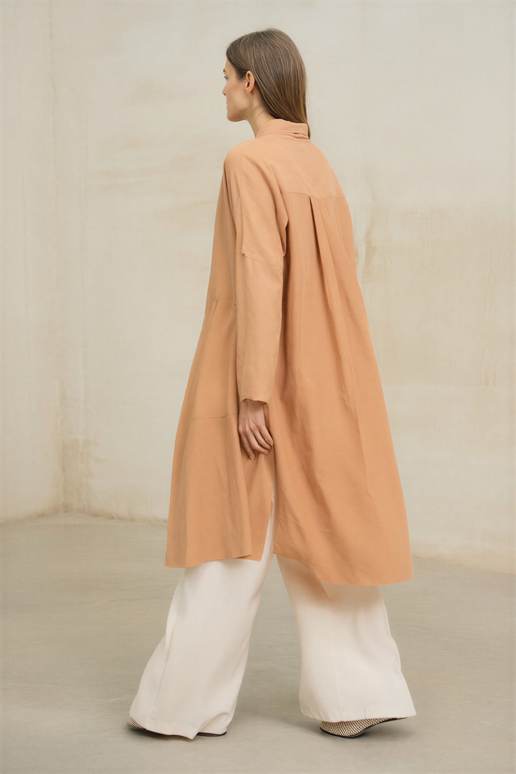 La levita Lirael color melocotón es una prenda ligera de líneas limpias y caída fluida, pensada para completar estilismos elegantes con un aire sofisticado y minimalista. Su diseño abierto, sin cierre visible, permite que el tejido acompañe el movimiento con naturalidad.
