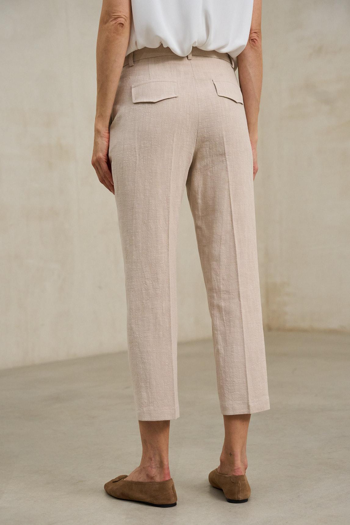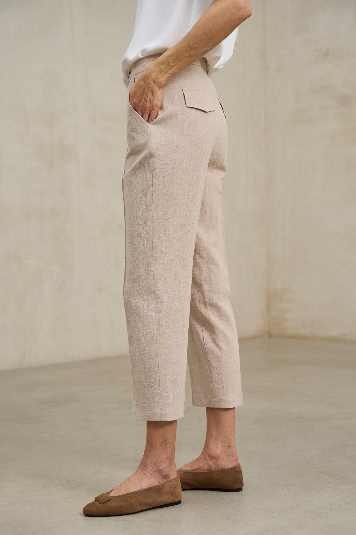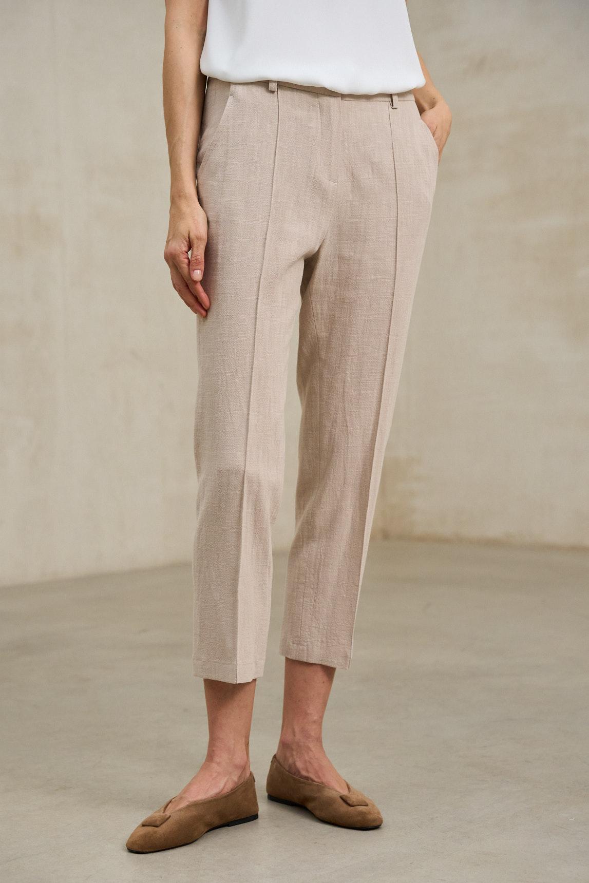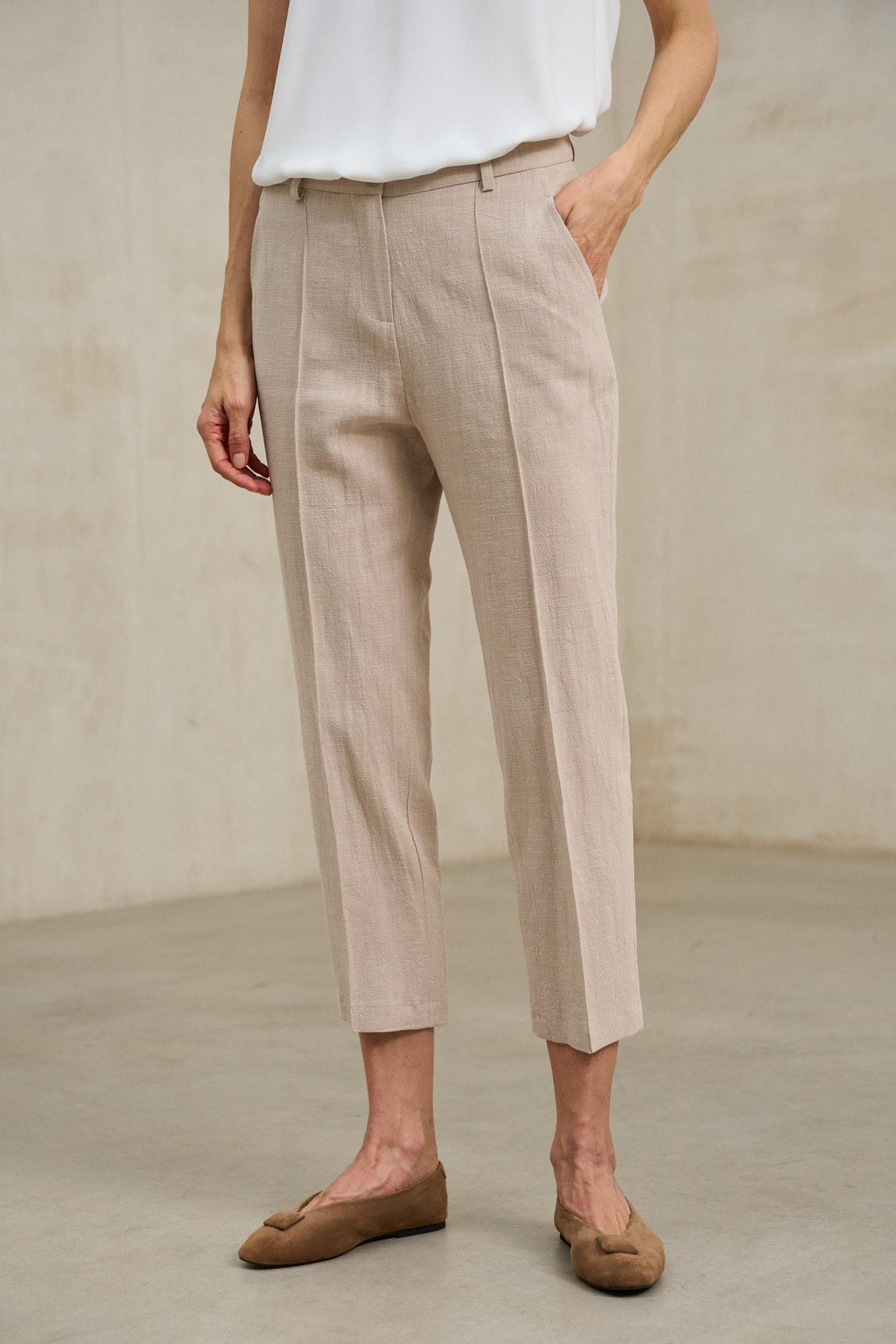 De líneas depuradas y aire sastre, este pantalón presenta cintura estructurada con trabillas, cierre frontal con botón y una abertura discreta que mantiene el delantero limpio. Las pinzas frontales aportan forma y caída, mientras los bolsillos laterales en diagonal suman funcionalidad sin romper la silueta. La pernera se estrecha suavemente hacia el bajo, con un largo tobiller o que estiliza y deja el look ligero. Su corte slim relajado equilibra lo formal y lo cotidiano: combina fácil con camiseta blanca y zapatillas para un contraste moderno, o con camisa y mocasín para un conjunto más pulido. En tonos neutros se integra sin esfuerzo y funciona como base para capas, desde un blazer corto hasta un punto fino. Disponible también en negro. Pensado para días de oficina, cenas informales o viajes, se lleva con naturalidad y siempre se ve cuidado: una prenda que define la figura con sutileza, acompaña el movimiento y eleva cualquier combinación con un gesto sencillo. Nos esforzamos por mostrar los colores de la forma más fiel posible, pero pueden variar ligeramente respecto a la realidad.
