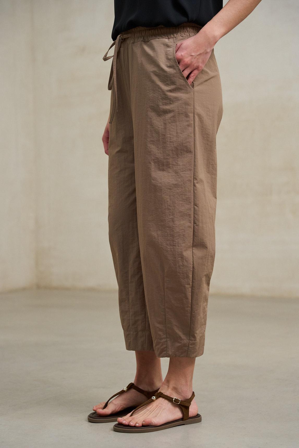 Este pantalón de cintura elástica fruncida destaca por su caída recta y amplia, con pinzas frontales que ordenan el volumen y aportan un acabado más cuidado. El color marrón se ve cálido y versátil, y la prenda mantiene un aspecto ligero y suave a la vista, con un largo por encima del tobillo que deja el look más aireado.
