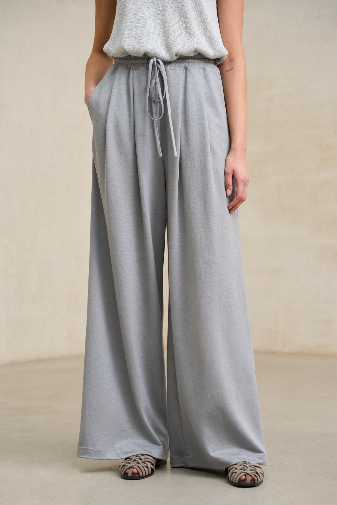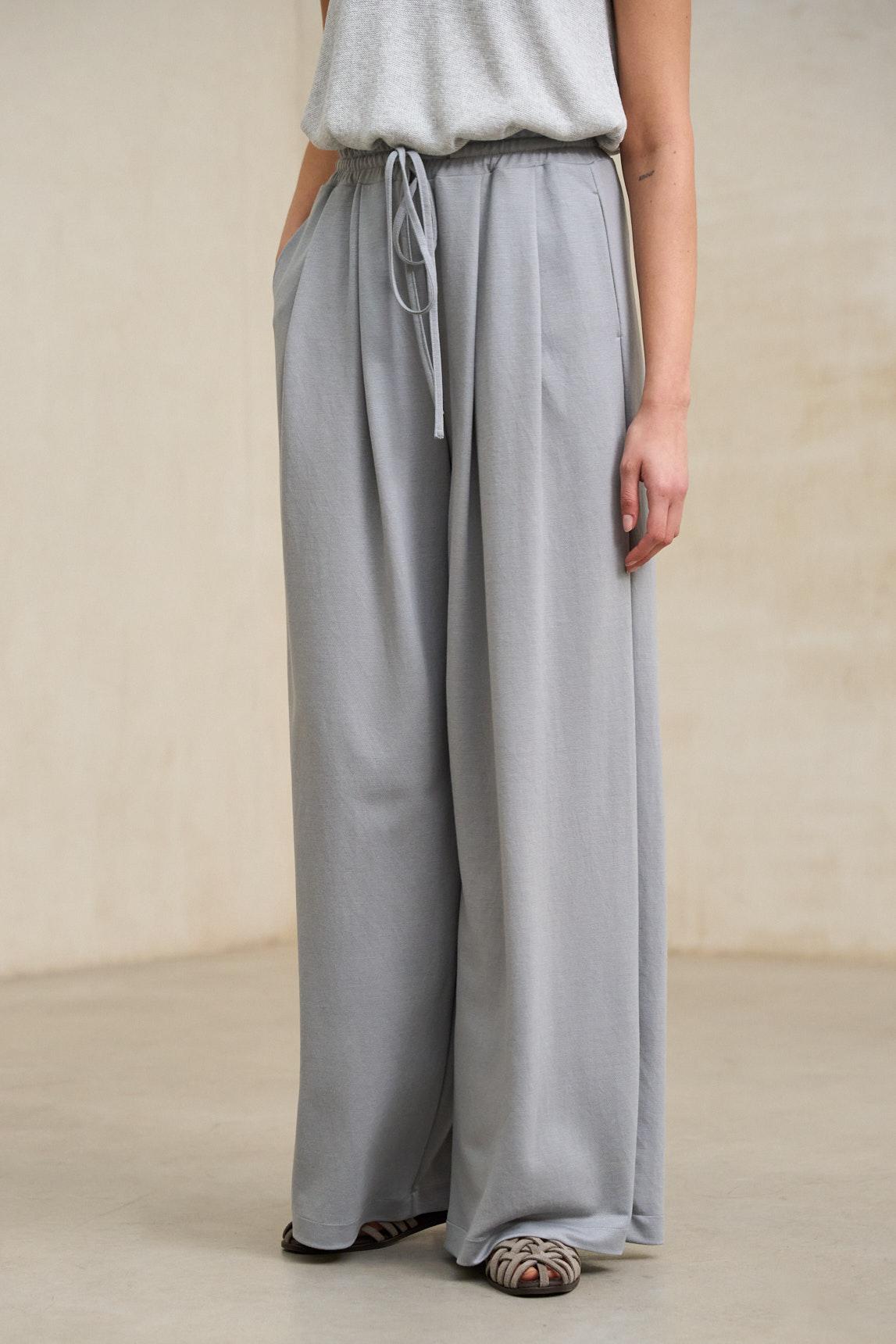 El pantalón Saurel gris claro presenta una silueta amplia y relajada, definida por su cintura elástica fruncida que aporta comodidad y un ajuste flexible. Confeccionado en tejido ligero de caída suave, su pernera ancha genera un movimiento fluido y natural al caminar.