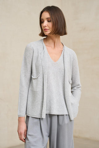 El diseño combina practicidad y elegancia informal, con un volumen equilibrado que estiliza sin resultar rígido. El tono gris claro aporta luminosidad y modernidad, integrándose fácilmente en estilismos neutros con blanco, crudo, azul humo o tonos piedra. Es una prenda ideal para el día a día, viajes o conjuntos coordinados donde se busca confort sin renunciar a una imagen cuidada. Puede combinarse con blusas fluidas, tops estructurados o chaquetas ligeras para crear looks relajados con intención.