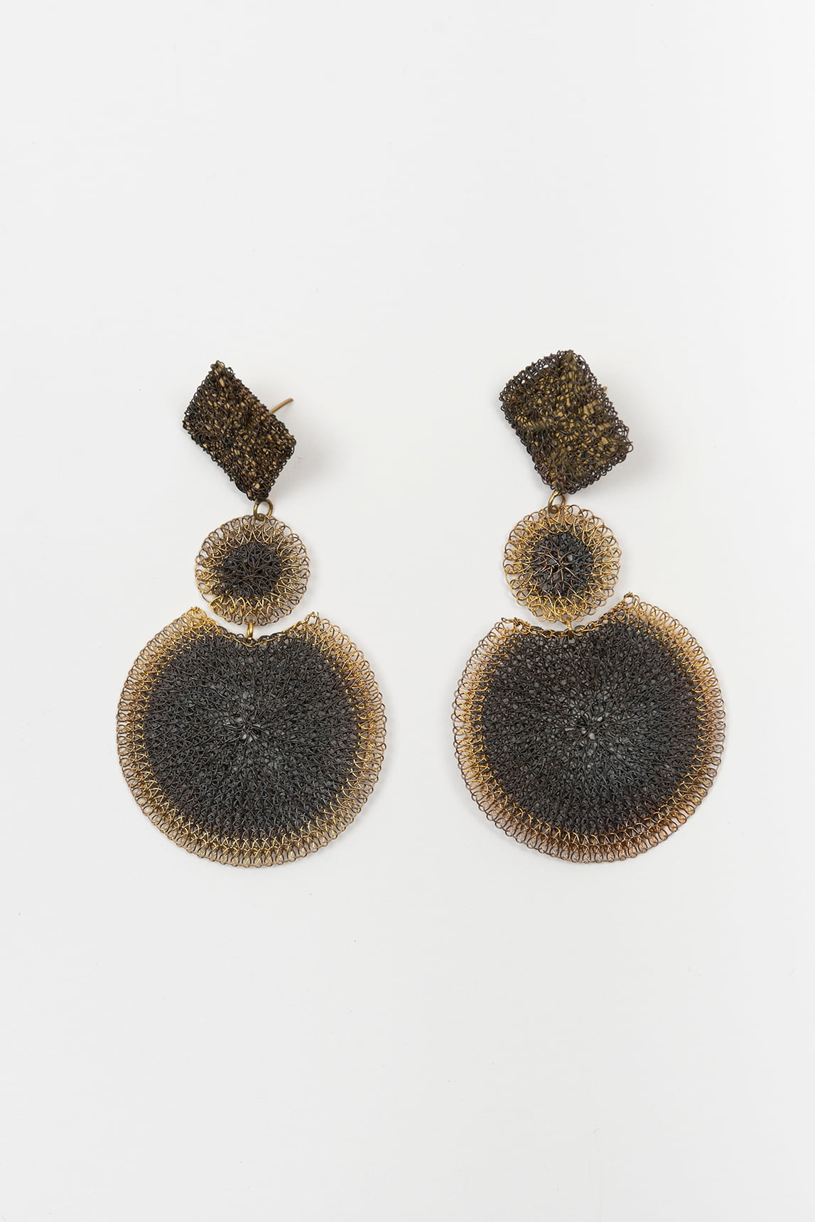 - Pendientes geométricos elaborados en malla metálica con efecto bicolor dorado y gris envejecido.