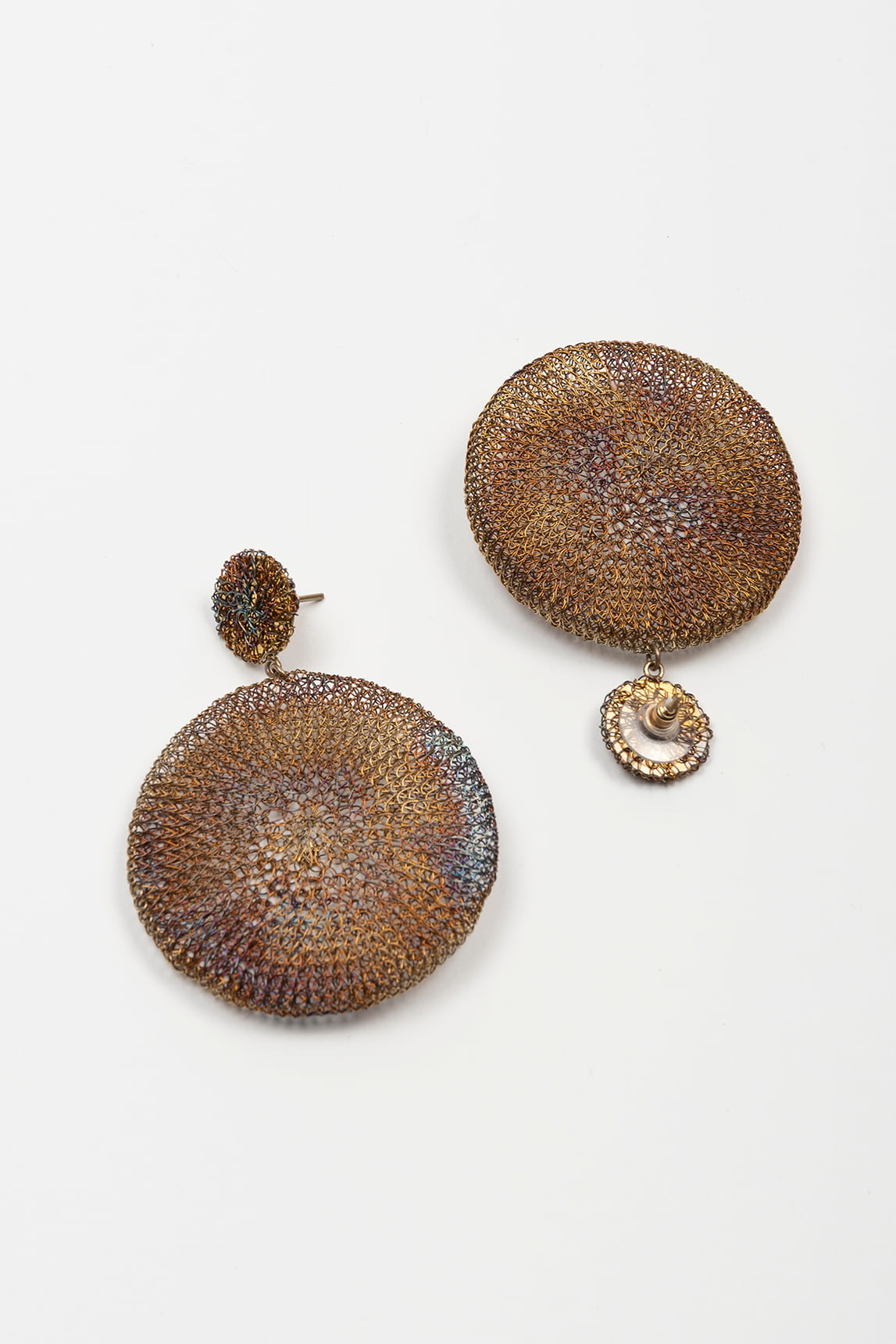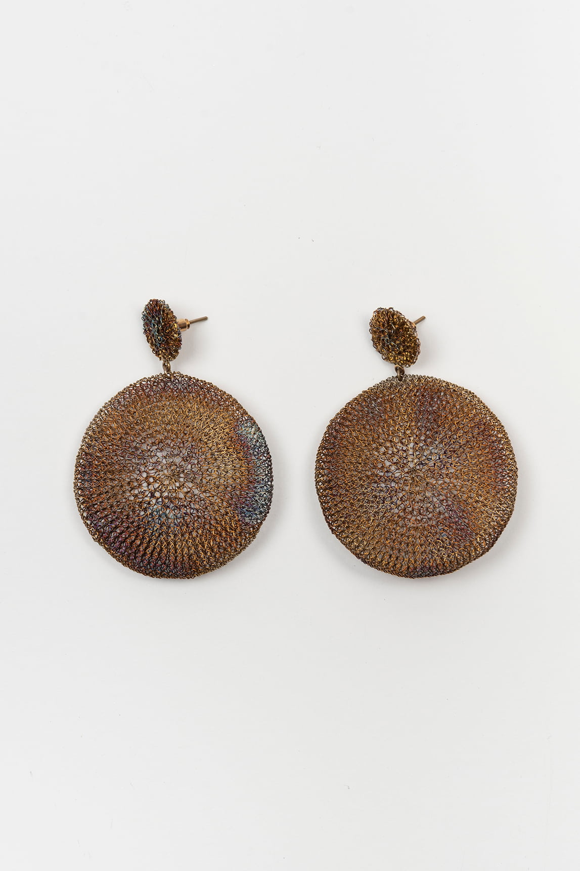 - Pendientes circulares de diseño artesanal en acabado iridiscente color cobre.