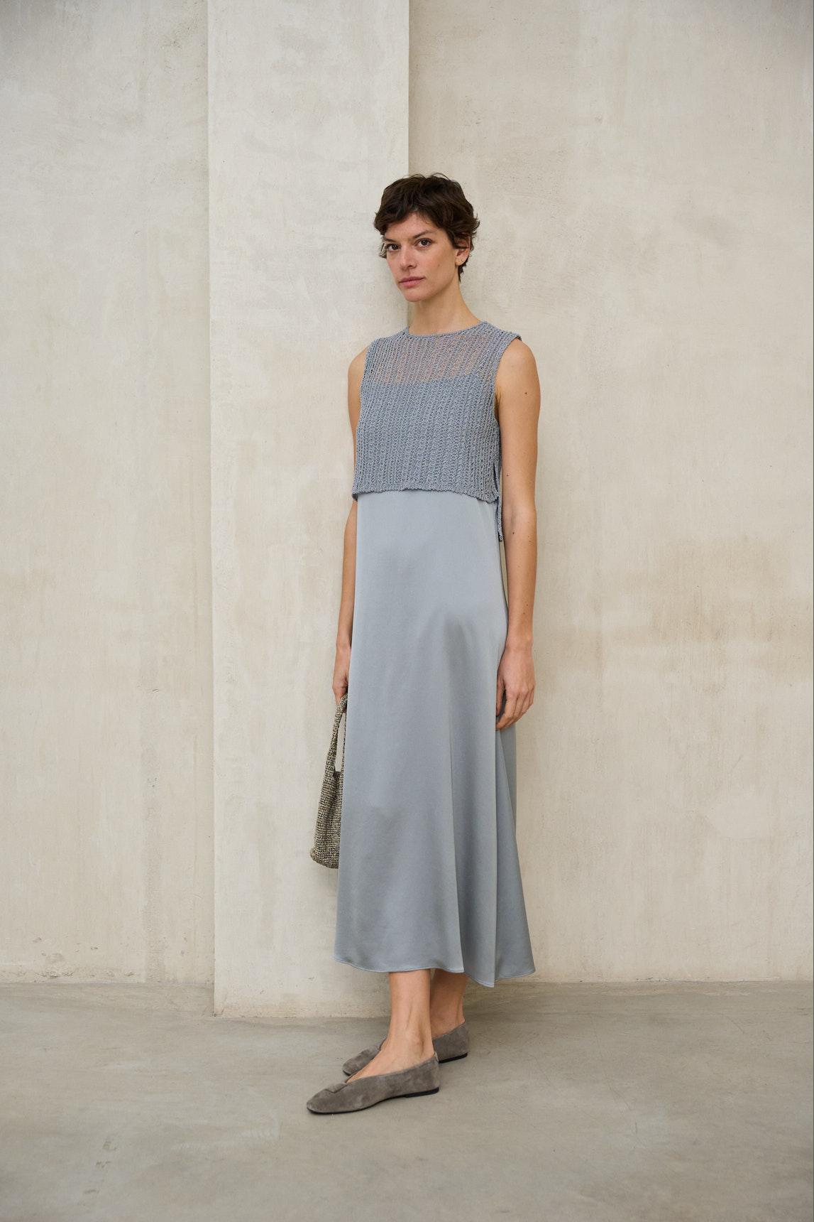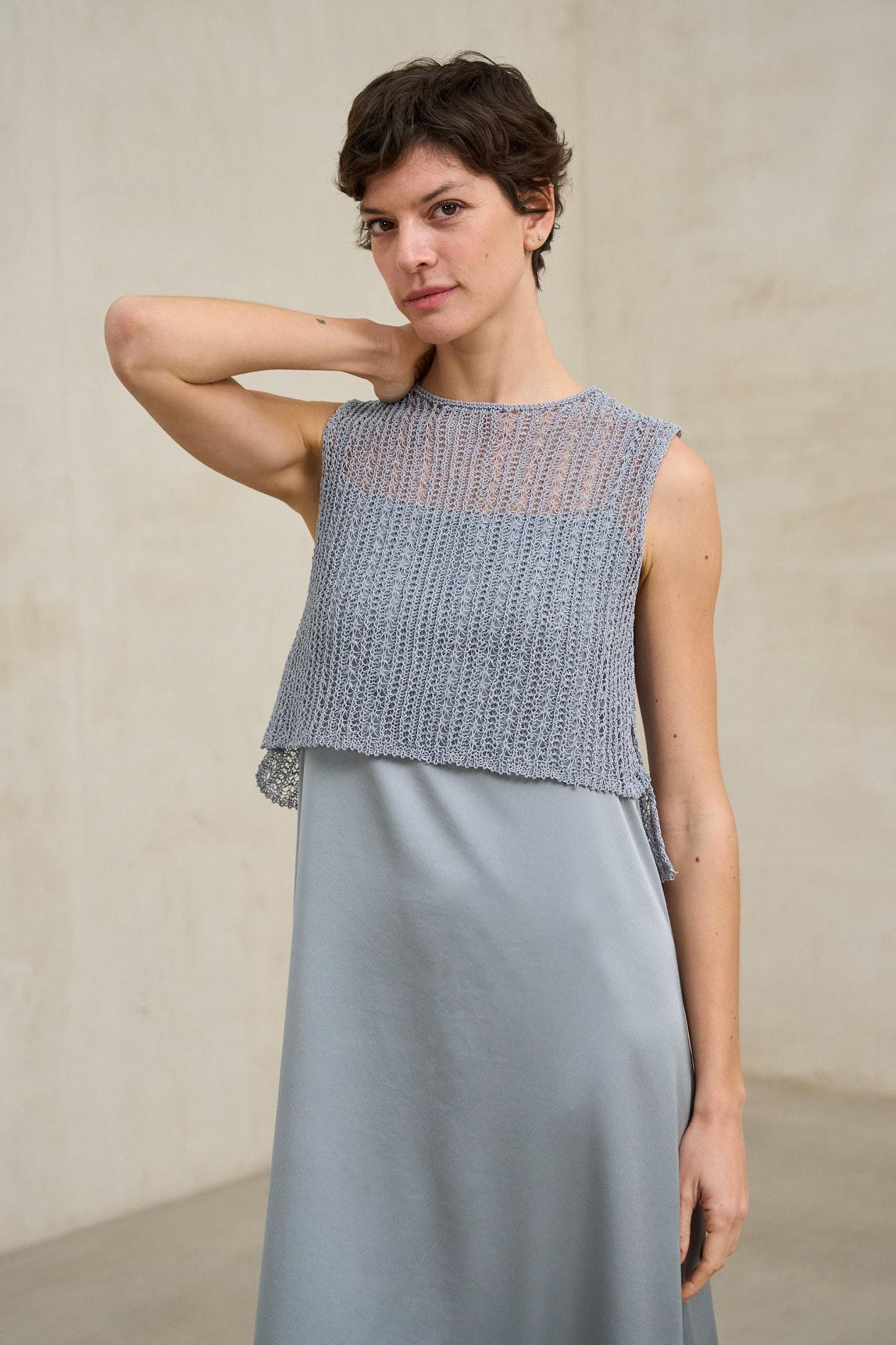 El chaleco Erya azul acero es una prenda ligera confeccionada en punto de textura abierta que aporta un efecto delicado y etéreo al diseño. Su trama semiabierta crea un sutil juego de capas, dejando entrever ligeramente la prenda interior, por lo que se recomienda combinarlo con un top base o camiseta lisa (no incluido). Presenta cuello redondo y diseño sin mangas, con una silueta recta y limpia que equilibra la textura del tejido. Su estructura ligera lo convierte en una pieza ideal para superposición, aportando profundidad visual sin añadir peso al conjunto. El tono gris azulado refuerza su carácter contemporáneo y versátil, permitiendo combinarlo tanto con pantalones fluidos como con faldas o denim. Es una prenda perfecta para estilismos de entretiempo que buscan textura, frescura y un acabado actual. Nos esforzamos por mostrar los colores de la forma más fiel posible, pero pueden variar ligeramente respecto a la realidad.