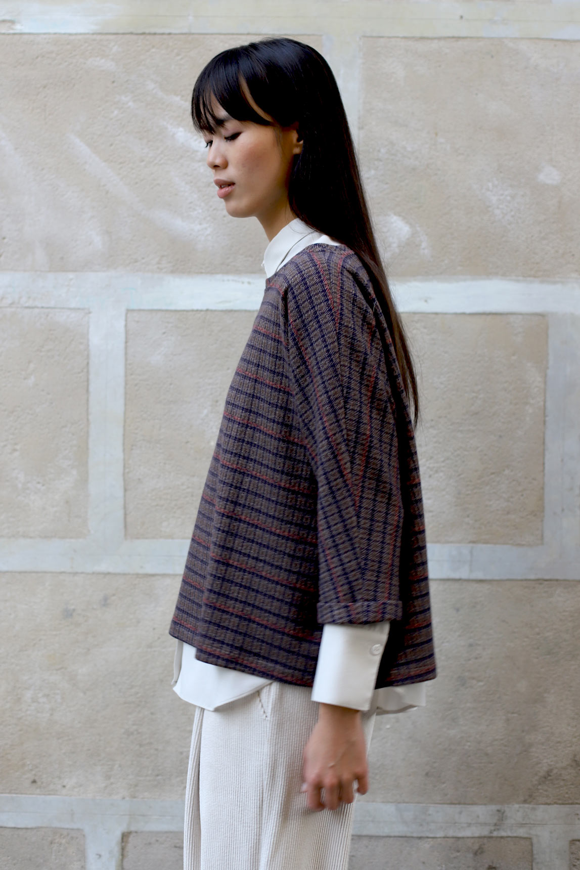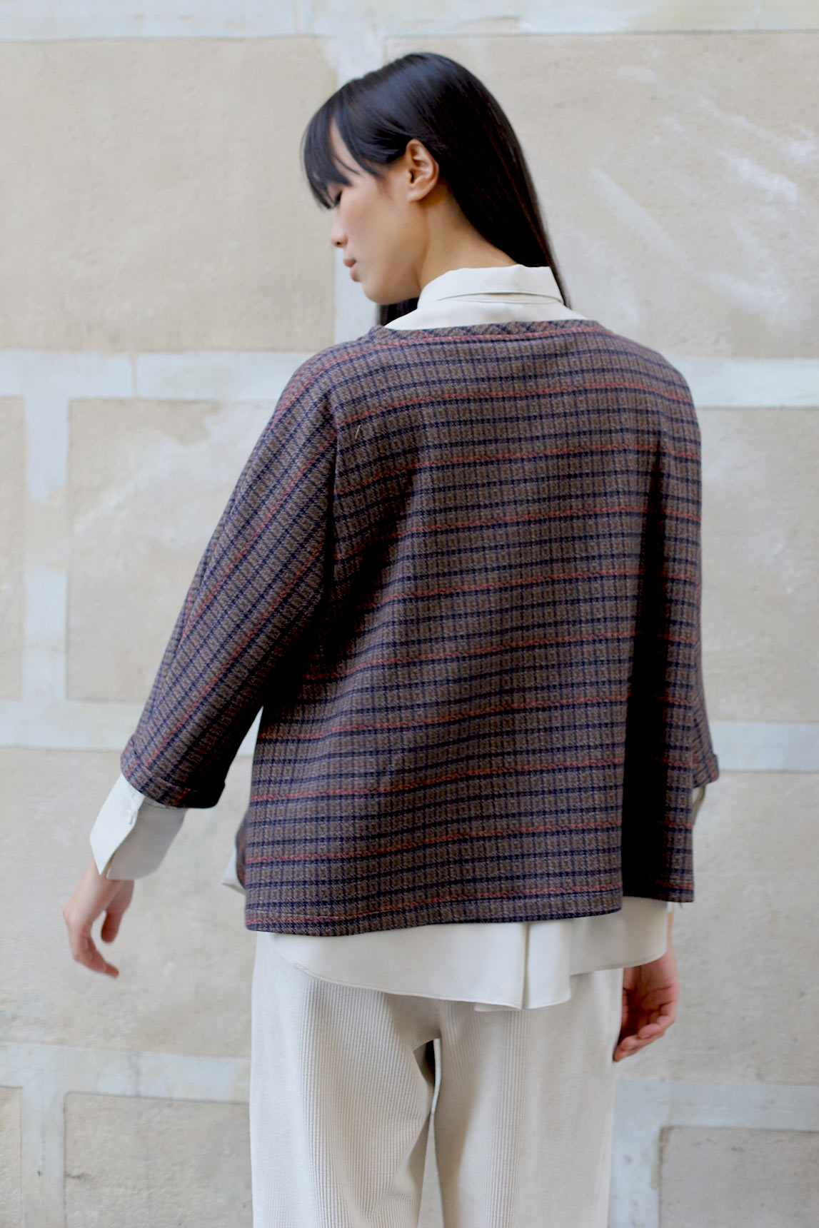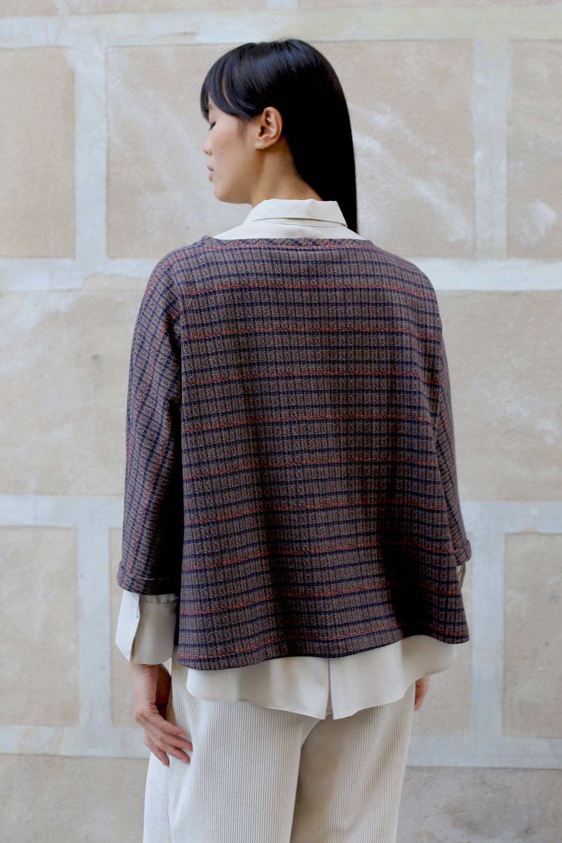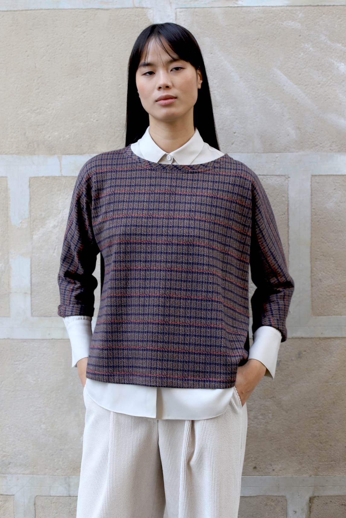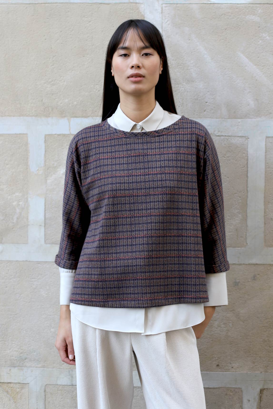 El top Tarento en cuadros burdeos combina un patrón de microcuadros en burdeos con toques antracita y crudo para un efecto elegante y fácil de combinar. Su silueta recta con caída fluida favorece sin ceñir y permite superponer sobre camisas o camisetas finas. La manga 3/4 y el cuello caja aportan un acabado pulido, perfecto para diarios de oficina o looks casual-chic con vaquero, sastre o falda midi.