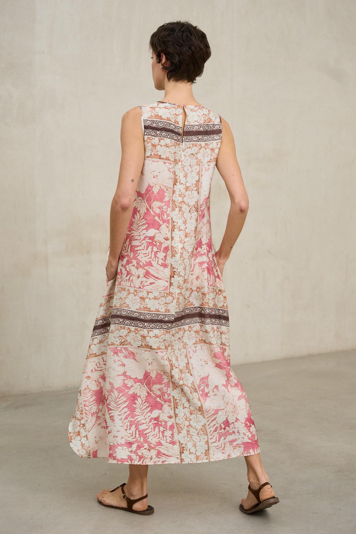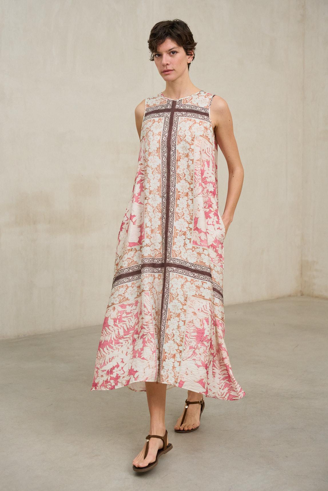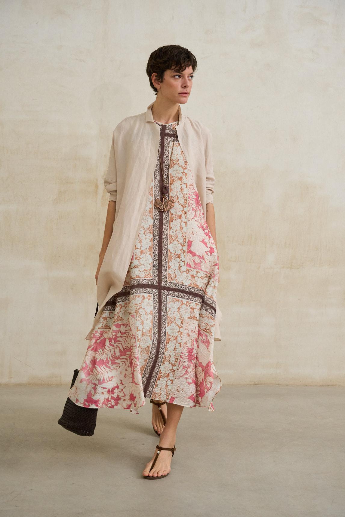 El vestido Arelia estampado coral es una pieza ligera y femenina que destaca por su silueta amplia y su delicado estampado floral en tonos coral sobre fondo claro. Su diseño sin mangas y escote redondo mantiene una línea limpia y favorecedora, ideal para los meses cálidos.