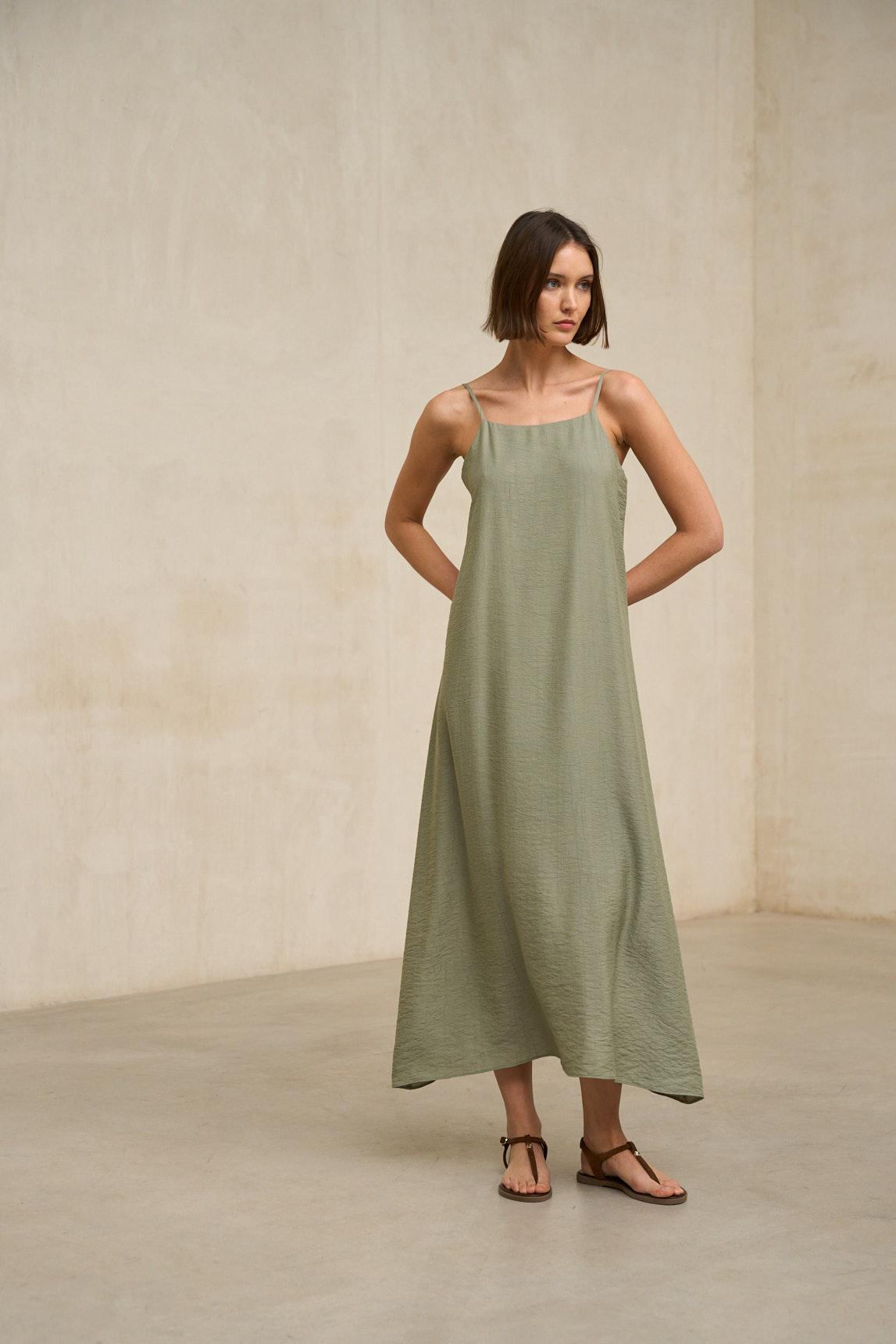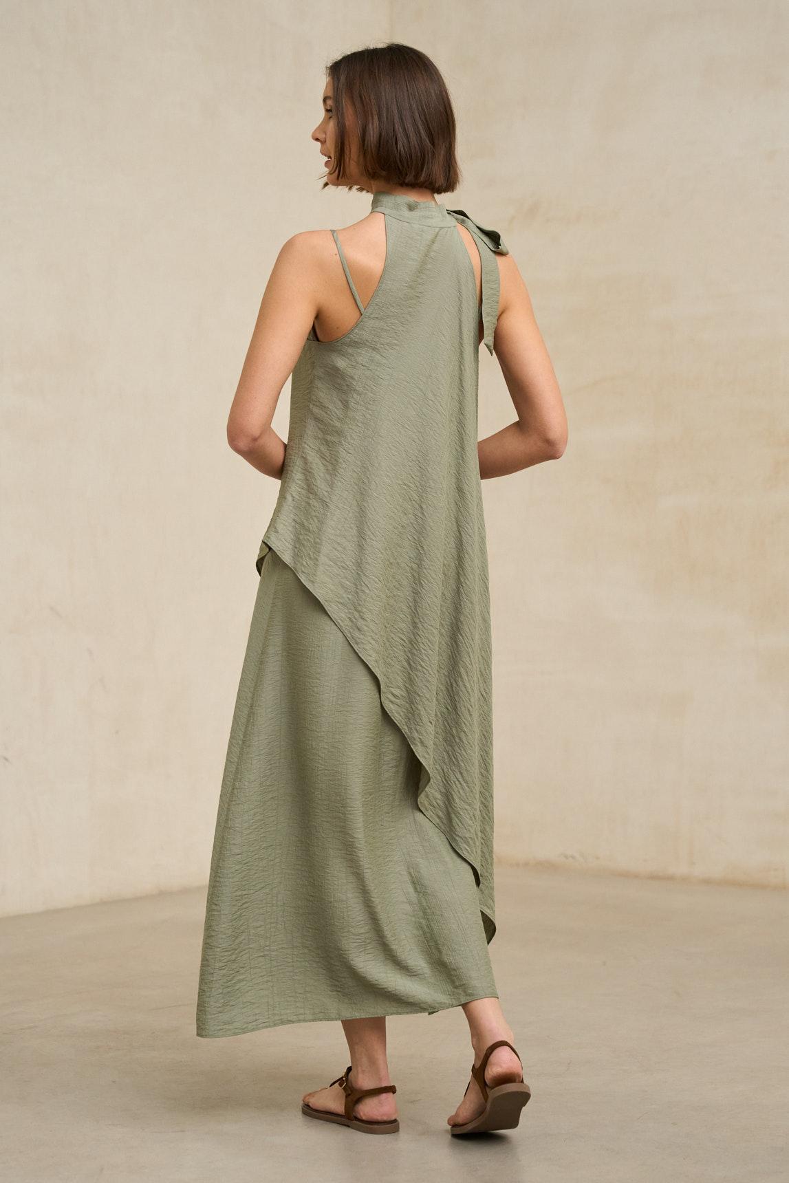 El Vestido Ilena verde salvia es un conjunto de dos piezas que se venden juntas, diseñado para aportar ligereza, movimiento y una elegancia natural con un enfoque contemporáneo. La pieza principal presenta una silueta amplia y fluida, confeccionada en tejido suave y vaporoso. Su diseño sin mangas y escote redondo limpio equilibra sencillez y sofisticación, mientras que el corte evasé genera una línea alargada que estiliza la figura. El bajo ligeramente asimétrico aporta dinamismo y fluidez al caminar, reforzando su carácter ligero y femenino. La segunda pieza complementa el diseño aportando mayor profundidad visual y versatilidad al conjunto, permitiendo que el vestido gane presencia sin perder su esencia relajada. El tono verde salvia refuerza su carácter sereno y actual, combinando fácilmente con accesorios en tonos arena, camel o dorado suave. Puede llevarse con sandalias planas para un look más relajado o con cuñas y complementos estructurados para una propuesta más pulida. Un conjunto versátil y atemporal, pensado para verano, viajes o eventos informales donde se busca comodidad sin renunciar a la elegancia. Nos esforzamos por mostrar los colores de la forma más fiel posible, pero pueden variar ligeramente respecto a la realidad.