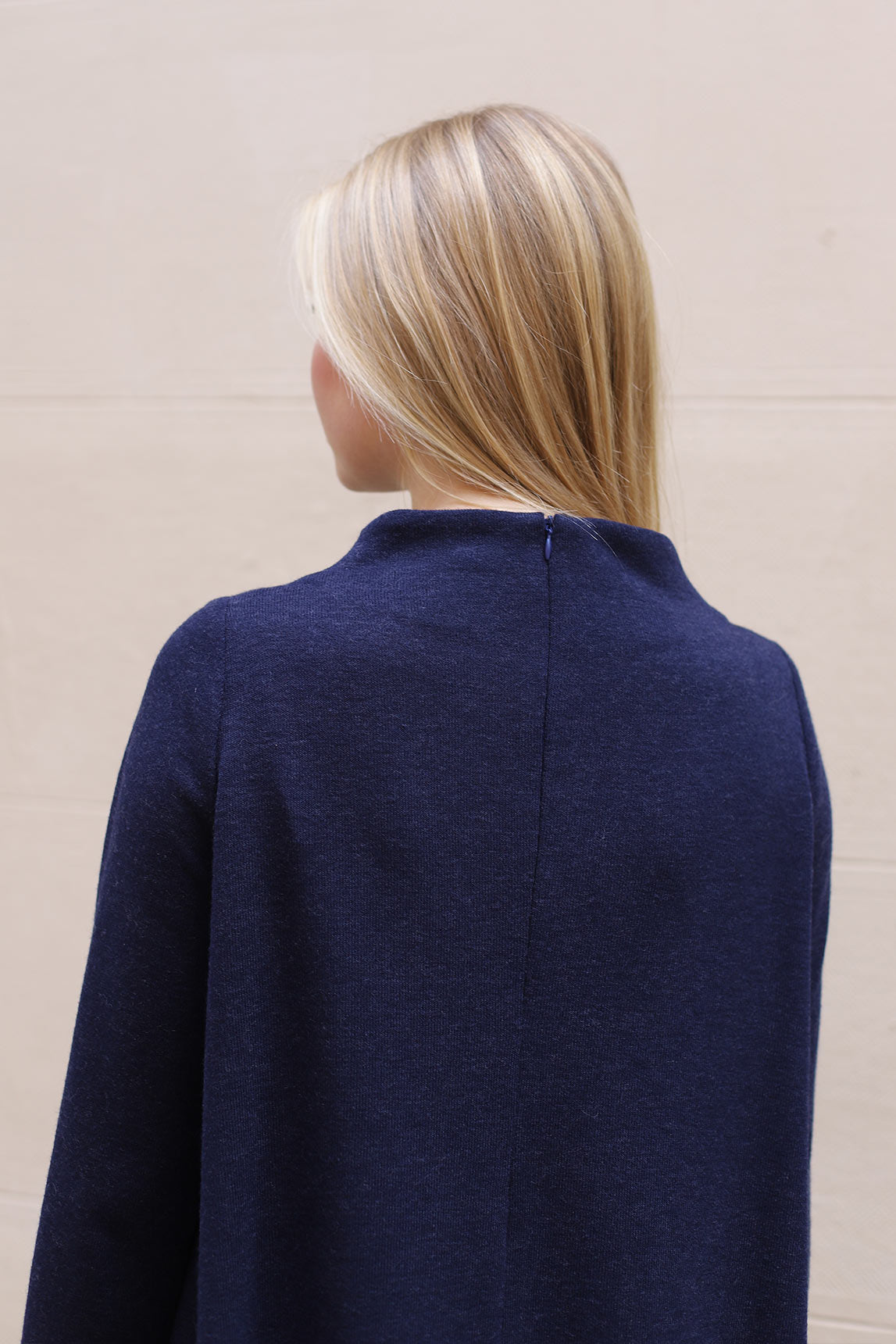 - Corte holgado con costadillo diagonal y falda con frunce.