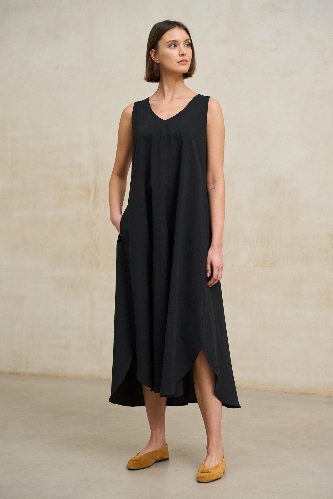 El Vestido Serely negro es una pieza de silueta amplia y elegante que combina sencillez y movimiento en un diseño contemporáneo. Confeccionado en tejido ligero de caída fluida, presenta escote en pico y corte sin mangas que estiliza la parte superior y alarga visualmente la figura. Su estructura evasé genera un volumen equilibrado que se despliega suavemente desde el torso, creando dinamismo al caminar. El bajo incorpora una ligera asimetría que aporta carácter y refuerza su efecto fluido sin perder sobriedad. El negro, profundo y atemporal, convierte esta prenda en un básico sofisticado que funciona tanto en looks de día con sandalias planas como en propuestas más pulidas con accesorios estructurados. Es una opción versátil para eventos informales, cenas o estilismos minimalistas con presencia. Un vestido cómodo, elegante y fácil de llevar que equilibra ligereza y carácter con naturalidad. Nos esforzamos por mostrar los colores de la forma más fiel posible, pero pueden variar ligeramente respecto a la realidad.